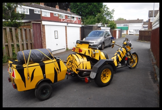 My trailer, which was bought for pulling behind my Gold Wing, took on a few tiger stripes in order to match the trike. Funnily enough it also ended up colour matched with multi coloured spiders too - in fact it's been painted to match a few vehicles of mine, but for now it stays paired up with the TCT.